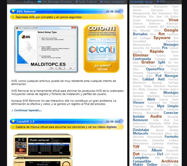 bueno he estado buscando la forma de colaborar en Cotonti.com y otros muchos sitios que me han ayudado a tener la web en marcha. Estube mirando para intentar traducir la traduccion completa pero no estoy preparado por que puedo cometer faltas ortografica, aun así me gustaria colaborar y lo que se me a ocurrido es poner publicidad en la web, de todos aquellos sitios que me an ayudado a mi. A partir de ahora cada 10 publicaciones pondre la publicidad de su web para intentar dar a conocer este gran cms como es cotonti. El sistema que se me a ocurrido es este, poner logotipos al lado de las imagenes y así aprovechar el espacio, pero de una forma vistosa para que quede bien y agradable. Saludos!! ![]() |