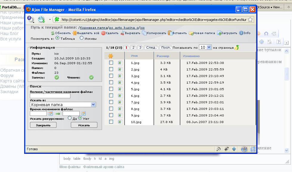 This plug-in includes Ajax FileManager, allowing to insert on edited page the link to a file (image, flash), from the folder on the server.
