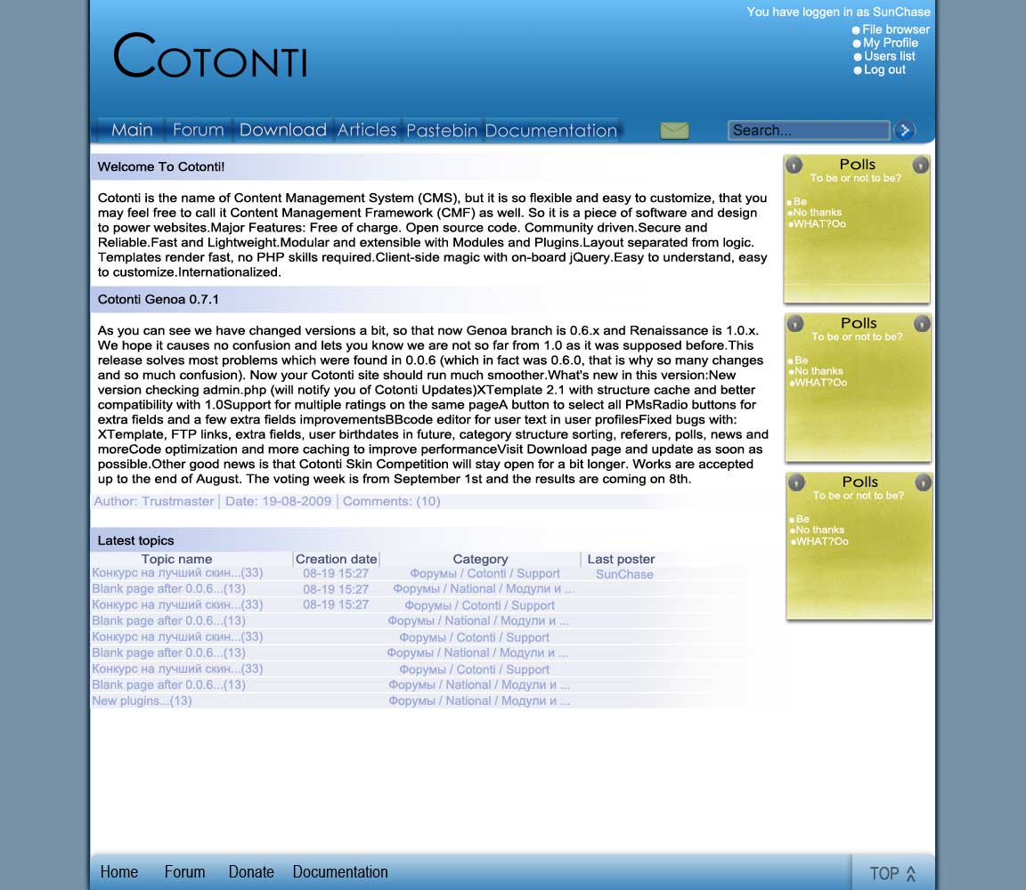Осталась одна - "вложением" в конкретный проект - красивый шаблон для Cotonti. О чем тут дальше говорить. |