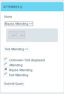 ![]() @Hodges - I'm working on the colour coding for event categories, great idea, what would you prefer, a preset list of colours to cycle in the settings or a per-category colour?. Someone suggested for space saving we should use a Facebook style display for the "Maybe Attending" and "Not Attending" blocks. The img alt tags are set to the username. Update: 04/12/2010 - Added Reccomend\Like buttons for FaceBook (Switchable in the event, uses local url tag to generate the like button - Anyone interested in a Cotonti plugin for this? - See https://www.mihsoft.com for example, the code to implement this in news and other areas can be found here https://www.mihsoft.com/forums.php?m=posts&p=3#3) Added 13 hours 6 minutes later: Just a quick update before the BETA release tonight. Bug Fixes - Fixed {EVENTEDIT_PAGETITLE} and {EVENTEDIT_SUBTITLE} language values not showing up. - Fixed incompatability with SED-Light template in event.edit.tpl and event.add.tpl Added 33 minutes later: Feature Update - New mode added for m parameter 'attendees' with params 'id' and 'state' - https://www.mihsoft.com/plug.php?e=events&m=attendees&id=1&state=1 (This will be shown in a popup window for each availability state or directly with the URL in a normal window with a View All option underneath each state. - New configuration option EventDetailsMaxAttendeesDisplay = 10 (Default is 10 per category). - New configuration option ShowEventAttendeesInPopup = 1 (Default is 1 (True)) Added 1 minute later: Beta Update: First Beta will be posted here before midnight GMT tonight, just tidying up code and adding comments where applicable. Not all features planned have made it in the first beta but it gives a good indication of things to come. Stay tuned... [b]Know the question and you will be far more likely to get an answer.[/b]