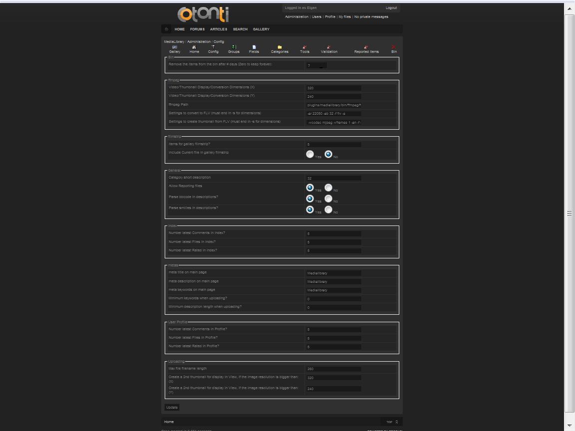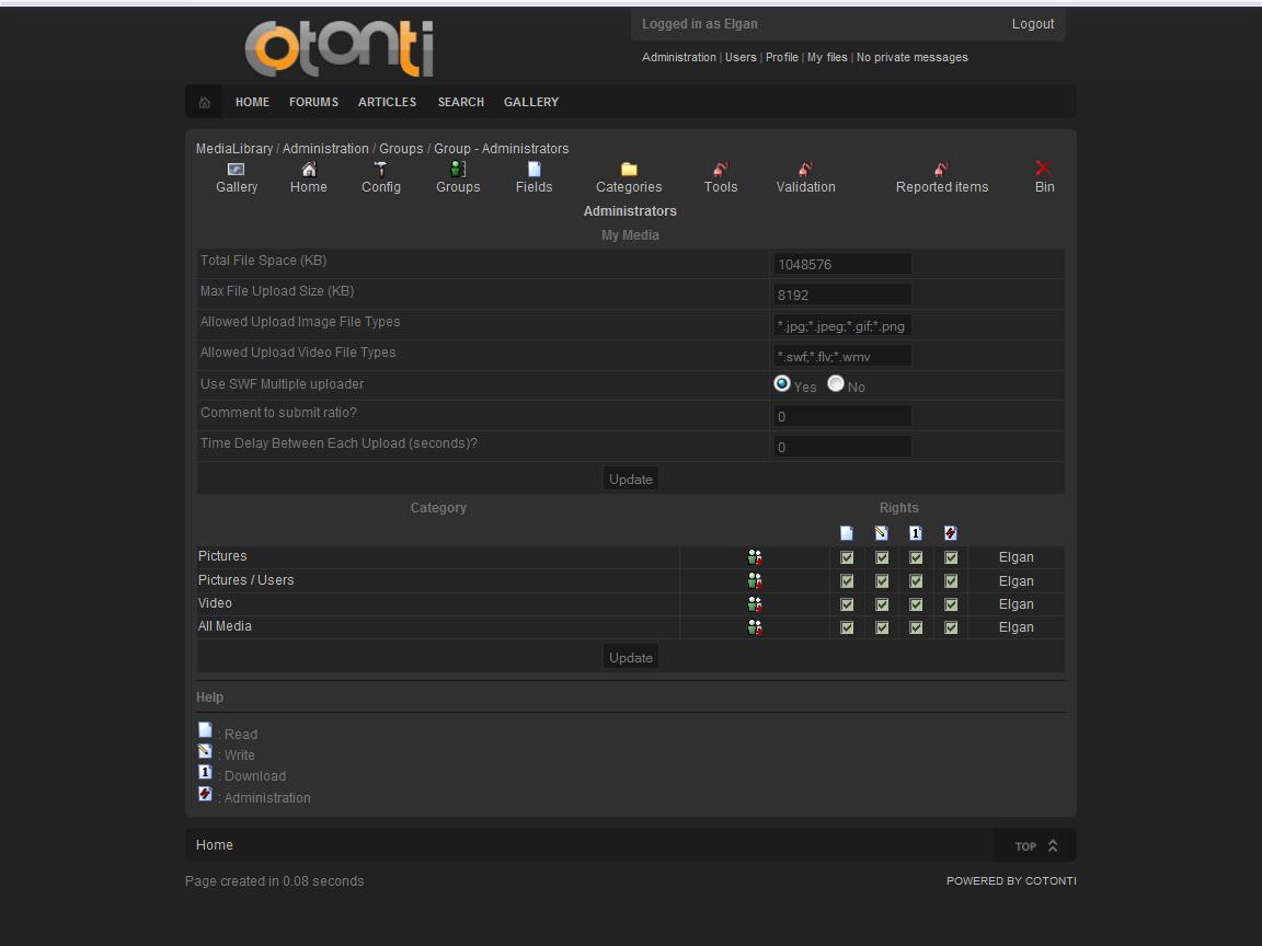 Rights per category and group. Categories System, Manage, move categories and files. Create unlimited and organized sub folders. Edit Extra fields. Tools -> Delete all thumbnails for recreation. Incase you add new thumbnail filters. Validation system, Per category files can be set to validate or need validation. Files take a new css class. Report system Per category can report files. Files take a new css class. Administration config system. Demo Website: Feel free to register. Logins: Admin User: admin Password: password User: user Password: password Images: http://www.ffmpeg.org/ http://swfupload.org/ Download Beta TODO: Things on my mind to add as i was uploading.