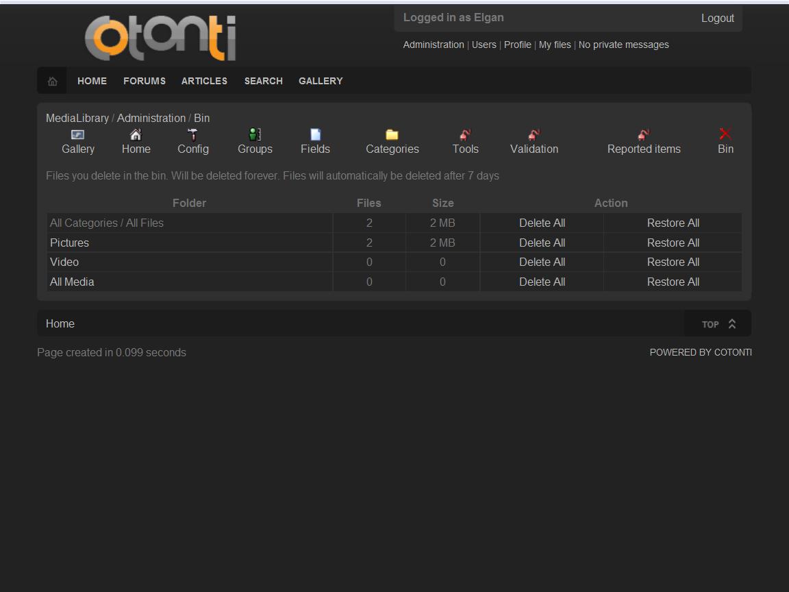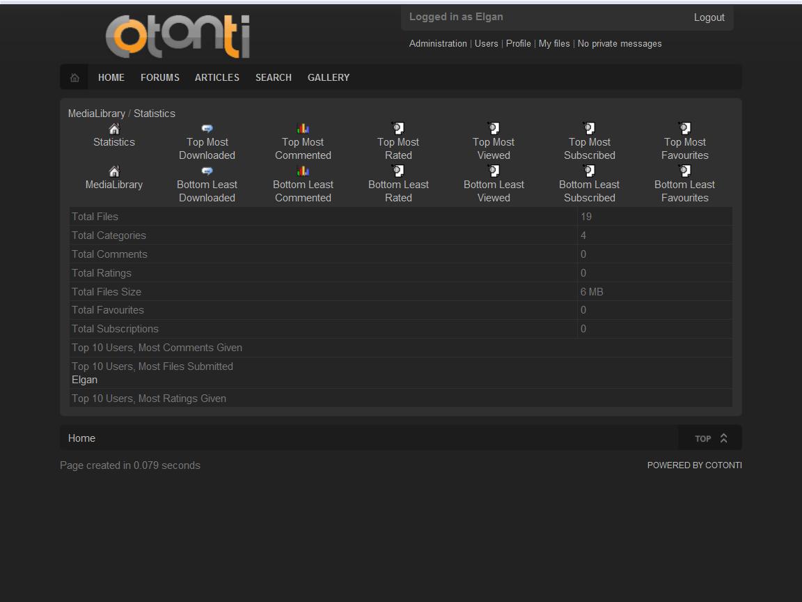 All link through one function to create thumbnails. Editable for improved thumbs. Comments intergration. Ratings intergration File stats Extra fields for files. Which can be specific in edit, upload, view, and categories. So allows you to add any details you want for files. Flv player, Ffmpeg compatable with settable transcoding and thumbnail creation. Many options and config system. Categories and sub categories system Files can be displayed as a list view or gallery view. With many options. Folders can be displayed as a list view or gallery view. With many options. With an icon or latest image. Uses engine functions to create thumbnails and intergration with cotonti. Total sud_url use. Meta title, descriptions and keywords. FOr categories and files , default metas can be set for search engine and website recognition. Skinnable with all tpls, even for index and details tags. Tags for display on index and in user profiles. Limited use of javascript. With use of jquery. Set options, limits for users to create comments, Such as time limits and comment to upload ratio limits. skinnable SWFupload plugin. Pages