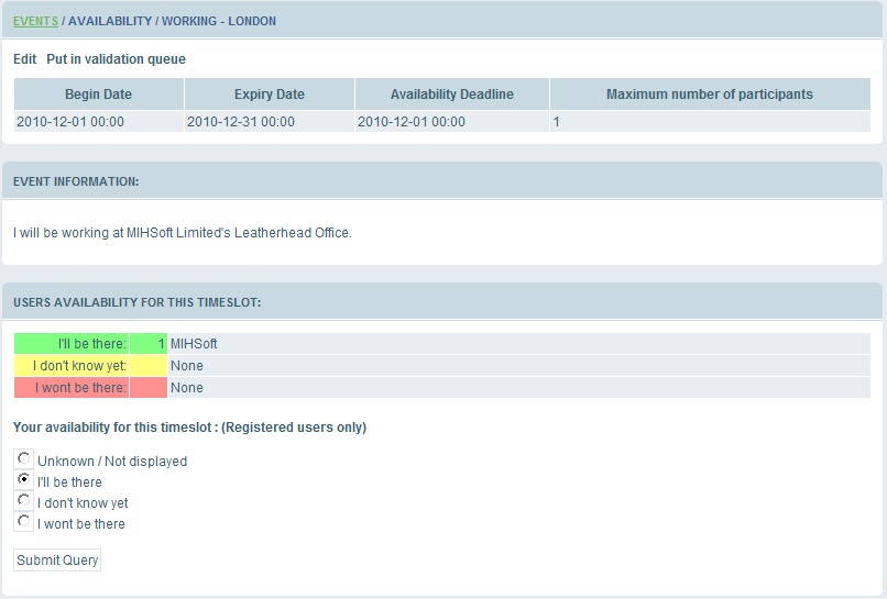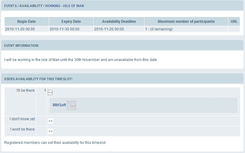 Screenshot(s): Avatars next to usernames Updated Details page Latest Demo: Here Download: Beta 2.2.08 is now available - Download - (This includes an updated SQL script based on the original update posted by Trustmaster in the original Event Calendar v2.1 download). PLEASE NOTE: This is a first beta and many of the functions are still being actively worked on. The code may contain bugs, defects and or other issues and is provided with no warranty of any kind, implied or otherwise. Some of the functons present in the BETA may not be present in the final versions. I do not recommend using this on LIVE sites, it is for testing purposes only, please excercise extreme caution!. Installation instructions Step 1: Run the appropriate SQL script for your version. Step 2: Copy the Events and Calendar folders to the Plugins directory on your server. Step 3: Open the Admin panel and Install the plugin. Step 4: Navigate to plug.php?e=events and plug.php?e=calendar Disclaimer: I am not and do not claim to be the original author and\or creator of the plugin mentioned at the top of this post. [b]Know the question and you will be far more likely to get an answer.[/b]