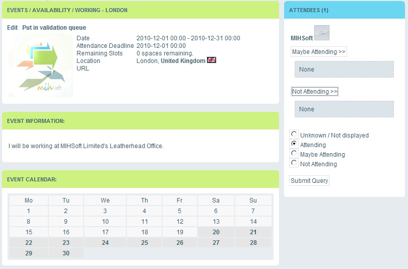 ![]() @everyone - I am currently studying for an exam but you can expect the first Beta version of this plugin by tonight :). Added 3 hours 41 minutes later: Last things to do for now are to tie-in the Mini Calendar with the Active Event on the page and add a new config option for how many attendees to display on the details page then I will bundle it all up ready for beta testing. [b]Know the question and you will be far more likely to get an answer.[/b]