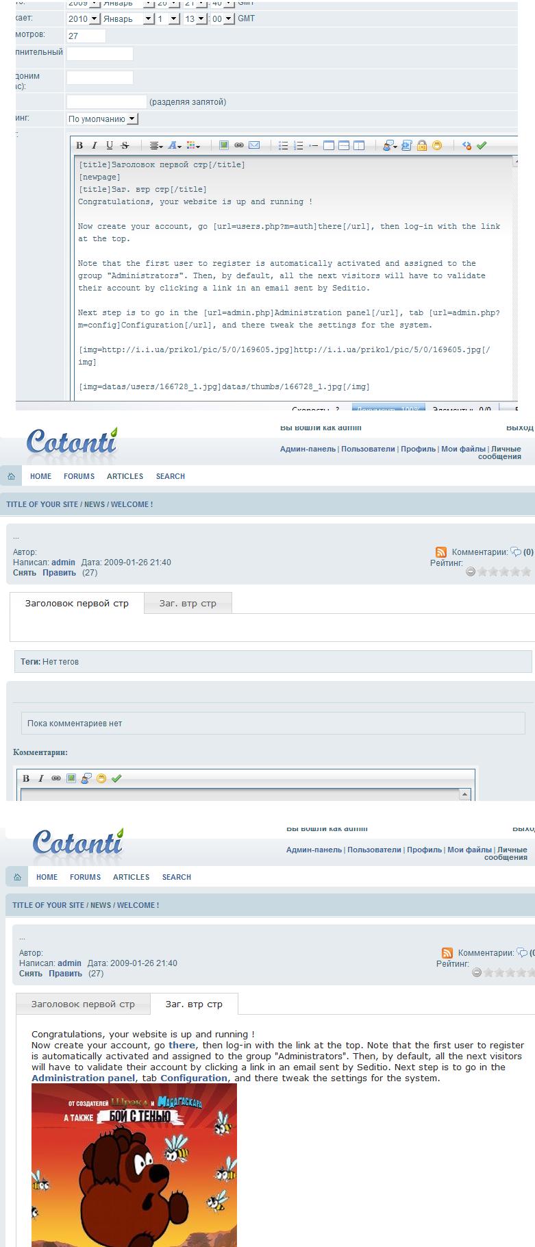 # Dayver : тег этот, котонти, обрабатывает(да еще и как красиво....спасибо Трастмастеру за это.....вот только еще не доработан плагин "news" что б коректно выводить эти теги) .... ну, а то что нет кнопки на панельке маркитапа так это ж поправимо(ну физически места не хватает что бы понаставить туды все кнопки ббкодов которые поддерживаются)....как вставлять кнопку на панельку Sergeich описал постом выше(делайте по аналогии). Нет тег этот не обрабатывается! [newpage]