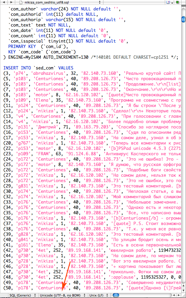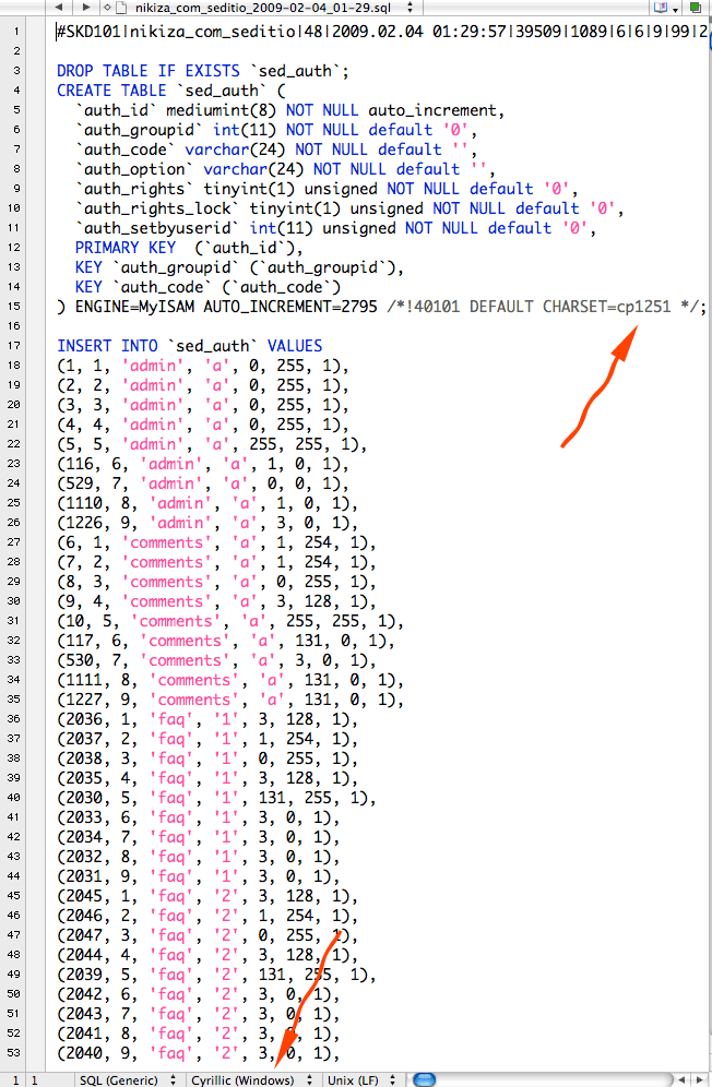 ПК извлечём из архива .sql файл и откроем его текстовым редактором, который советовал выше и обратим внимание на места обозначенные стрелками. Это места подтверждающие то, что дамп имеет кодовую страницу