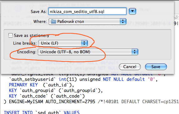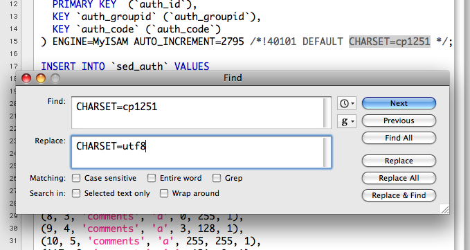Далее по тексту дампа осуществить поиск ctrl+f Windows и nix или cmd+f для Mac Os X и заменить все вхождения CHARSET=cp1251 на CHARSET=utf8, конечно же только в тех местах где это надо!!!