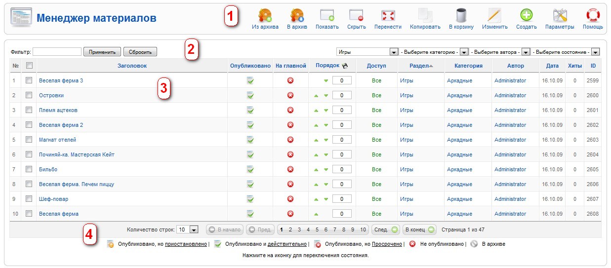 3 - the List of pages. Table column headings also are filters, which allows to sort the list. Also this list allows to publish/unpublish page by click on an icon, sort the list of pages in a category, customise access rights