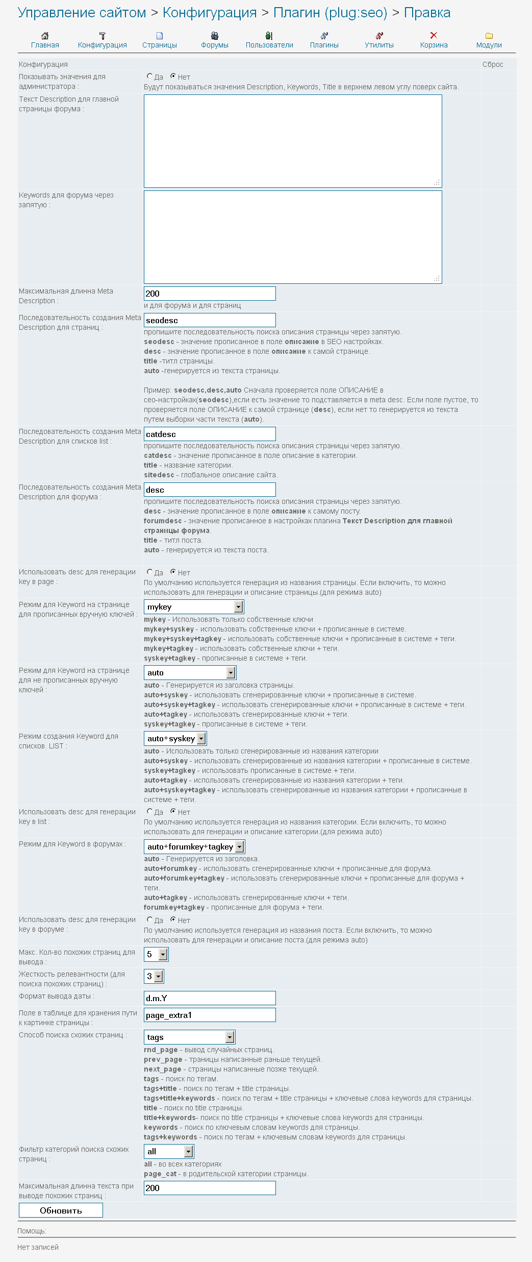 Fox: Плагин не только для кейвордов, он глобальный, для SEO оптимизации всего сайта. Заголовки, описания, ключевики для страниц, списков, форумов. Посмотри скрины и все понятно будет. Это скрин глобальных настроек плагина: Это скрин настроек плагина для страницы: |